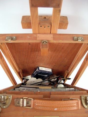 Margaret Keane (Amy Adams) screen used, wood 'Jullian Paris' French fold up easel with paint and brushes inside. (approx. 19 1/2" x 13 1/2" folded)