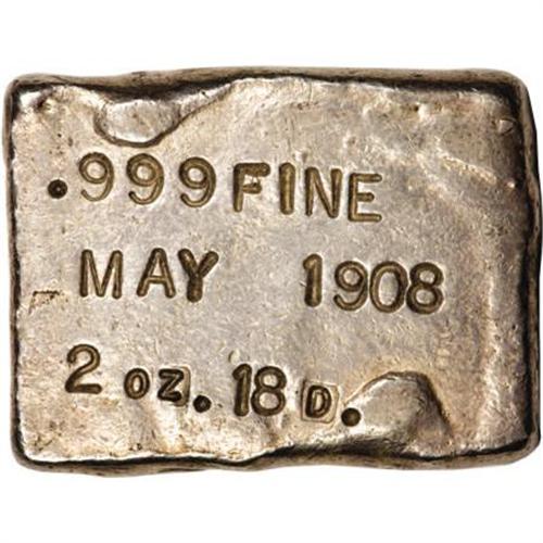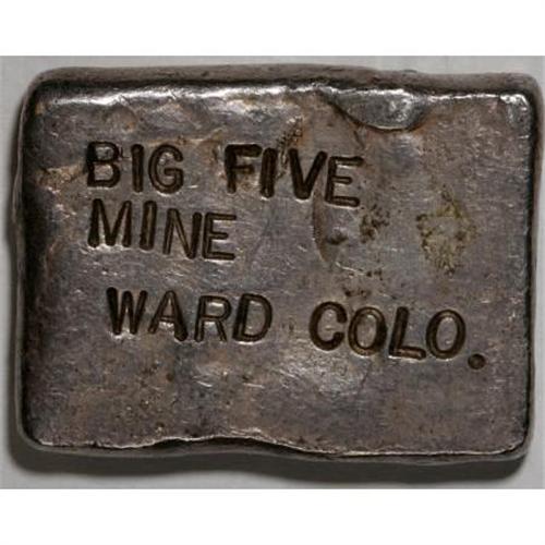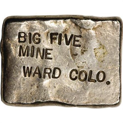 <B>Big Five Mine Silver Ingot. 2 Ounces, 18 Pennyweight.</B></I> The Big Five Mine was first discovered in 1861, but the mine was not extensively worked until the 1890s. Possibly a presentation ingot, as dore ingots were generally not made from refined silver. Stamped on both sides. One side reads: BIG FIVE / MINE / WARD COLO. The other side reads: .999 FINE / MAY 1908 / 2 oz. 18 d. Measures: 21 x 42 mm.<BR><BR><b>Shipping:</b> Coins & Currency (<a target="_blank" href="http://www.heritageauctions.com/common/shipping.php">view shipping information</a>)
