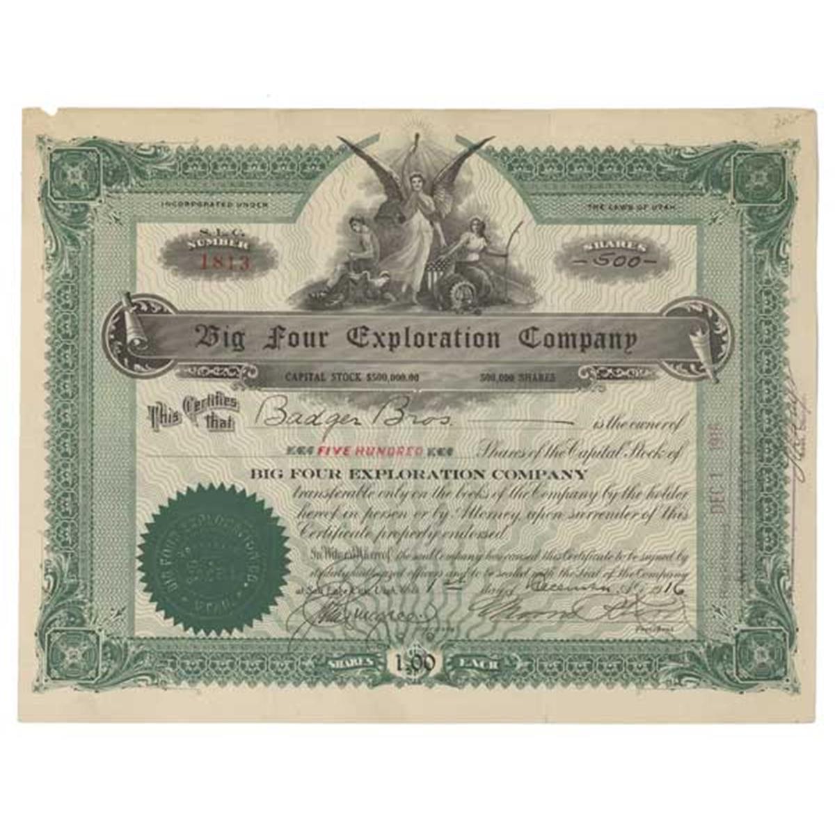 1917. Utah. Stock certificate for 100 shares. Black/Green with green seal. Vignette at top center of three allegorical figures. Uncancelled. Very fine.