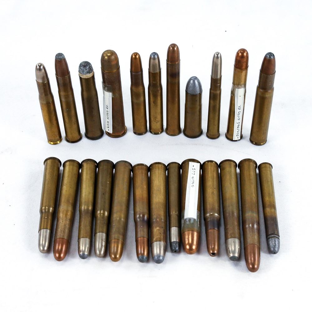 Includes 600 Nitro Express Morrow, 500-465 Nitro Kynoch, 400P Kynoch, 505 Gibs, 500-465 Nitro Ex Bell, 577 Nitro Kynoch, 2rds 400 Nitro Kynoch, 400S Kynoch, 577short Nitro Kynoch, 400-350 Nitro Kynoch, 3 rds 404 Nitro, 470 Nitro Kynoch, 476 Nitro Kynoch, 416 Nitro Kynoch, 450-400 Nitro Kyock, 475 No2 Nitro Kynoch, 450 Nitro Kynoch, No2 Express Eley, and 400-350 Nitro Eley.