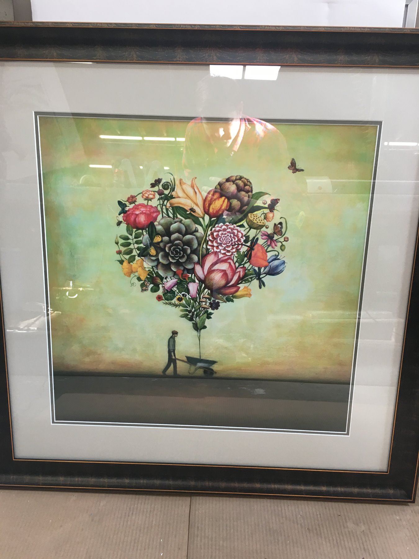 This piece is framed in a 3 inch rustic brown/taupe embelished molding and is shown with double mats. Outside dimensions are 37" wide, 32" high