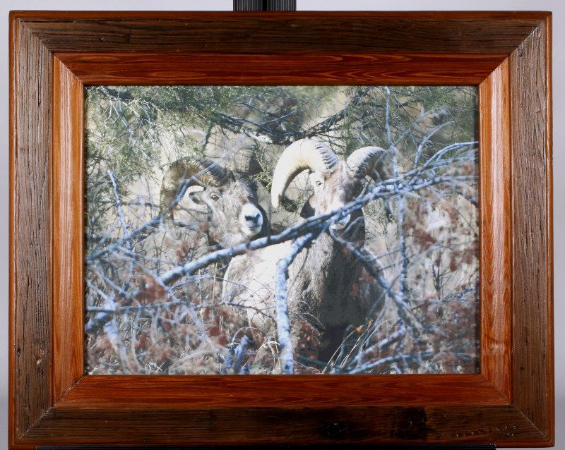 This is an original work of art Giclee photographic print on stretched canvas. The piece is hand signed in ink lower right by the artist. This features a Montana Mountain Scene with a two Rocky Mountain Rams. The frame is from the 1940 Redwood Seating from the Red Rock Theater Red Rocks Park in Morrison, Co. This is the wood many travelers from across the entire world could have stepped foot on and also comes with the certificate of Authenticity. The frame measures 20.5”x25.25" 1.75” thick and the artwork is 13.5”x18.25”