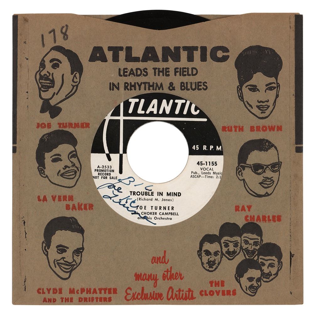 Atlantic Records 45 RPM promotional single for 'Trouble in Mind / I Need a Girl,' signed on the label in black ink, "Big Joe KC Turner." Includes the original Atlantic Records record sleeve with floating heads of artists like Ray Charles, Clyde McPhatter, and more. In fine condition.