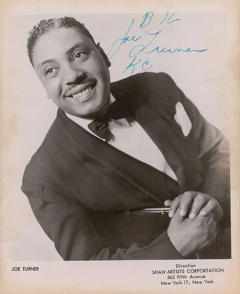 American blues shouter from Kansas City, Missouri, (1911–1985) whose fame peaked in the 1950s with his pioneering rock and roll recordings, particularly 'Shake, Rattle and Roll.' Vintage glossy 8 x 10 publicity photo of Turner in a handsome half-length seated pose, signed in blue ink, "Big Joe Turner, KC." In fine condition, with light discoloration along the edges.