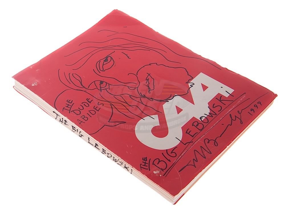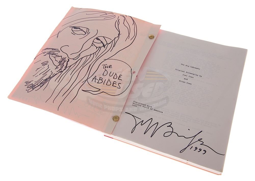 (Gramercy Pictures, 1998) This 119 page script is dated 1996 and has all white pages. The script features two self portraits by Jeff Bridges as his character "The Dude" and has been autographed twice by Jeff Bridges. One portrait and signature are on the front cover of the script and the second portrait and signature are on the back-side of the cover and on the title page. Both are dated 1999. Minor wear to the script is present.