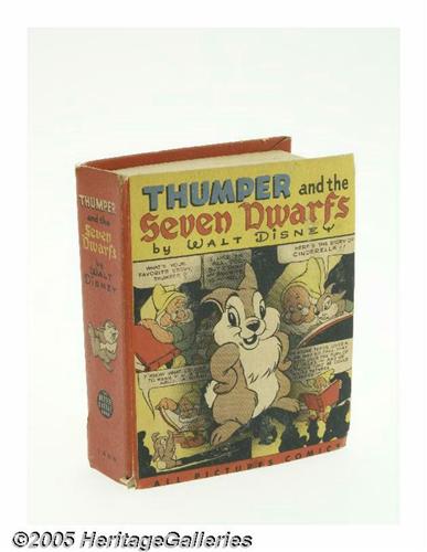 <B>Big Little Book #1409 Thumper and the Seven Dwarfs (Whitman, 1944) Condition: FN.</B></I> This cute Big Little Book combines Thumper (from Bambi) with the Seven Dwarfs of Snow White fame for a fun All-Pictures Comic edition. Pages are still supple and fresh; it appears this book was very carefully read once or twice, but never opened enough to break the spine. A very nice BLB indeed! Measures 3.75" x 4.5". Written and illustrated by the Walt Disney Studios. Overstreet 2005 FN value = $60. <I>From the Larry Jacobs Collection.</B></I>