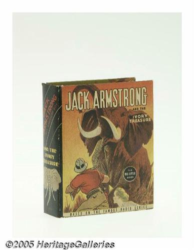 <B>Big Little Book #1435 Jack Armstrong and the Ivory Treasure (Whitman, 1937) Condition: NM-.</B></I> Hard cover, 432 pages. Standard size 3.625" x 4.5" x 1.5". Written by Leslie N. Daniels, Jr., and illustrated by Henry E. Vallely. Cover art by Henry E. Vallely. First Jack Armstrong Big Little Book. The cover title is different than the title on the title page, "Jack Armstrong, the All American Boy, and the Ivory Treasure". The "Jack Armstrong" radio program, one of the longest-running radio series, was first heard on CBS on July 31, 1933 and sponsored by Wheaties. Overstreet 2005 VF/NM value = $70.