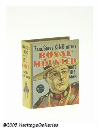 <B>Big Little Book #1452 Zane Grey's King of the Royal Mounted Gets his Man (Whitman, 1936) Condition: NM-.</B></I> Hard cover, 432 pages. Standard size 3.625" x 4.5" x 1.5". Outlined by Zane Grey with text written by his son, Romer Grey. Illustrated by Allen Dean. Overstreet 2005 VF/NM value = $80.