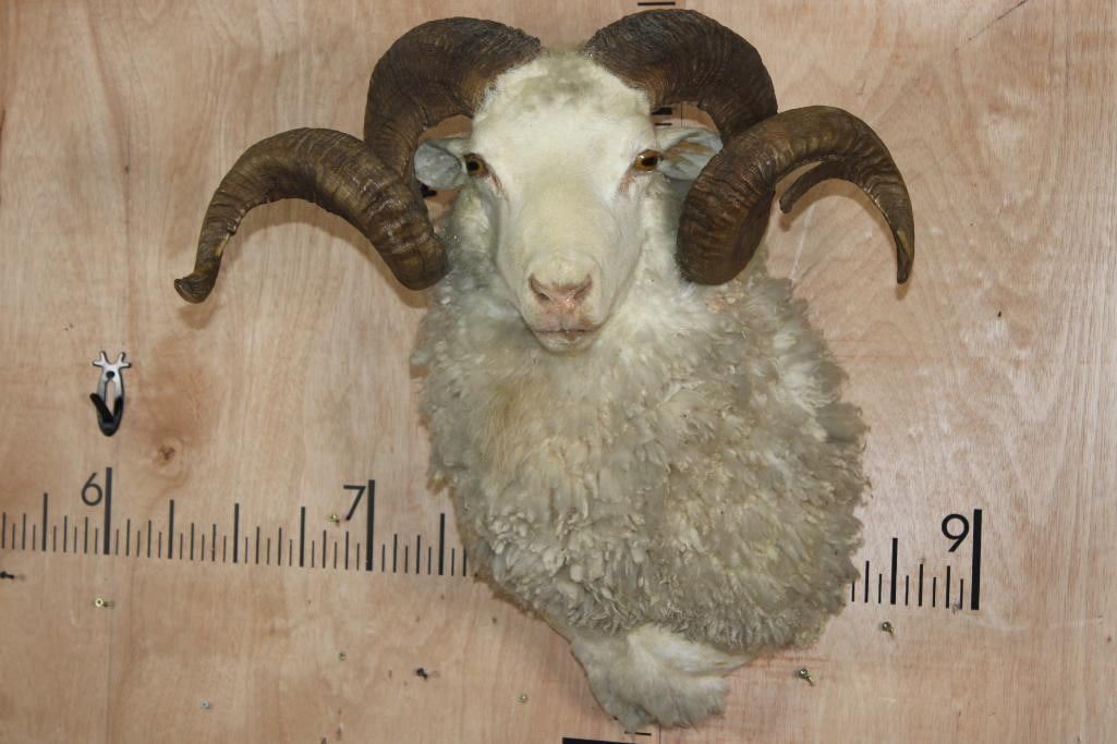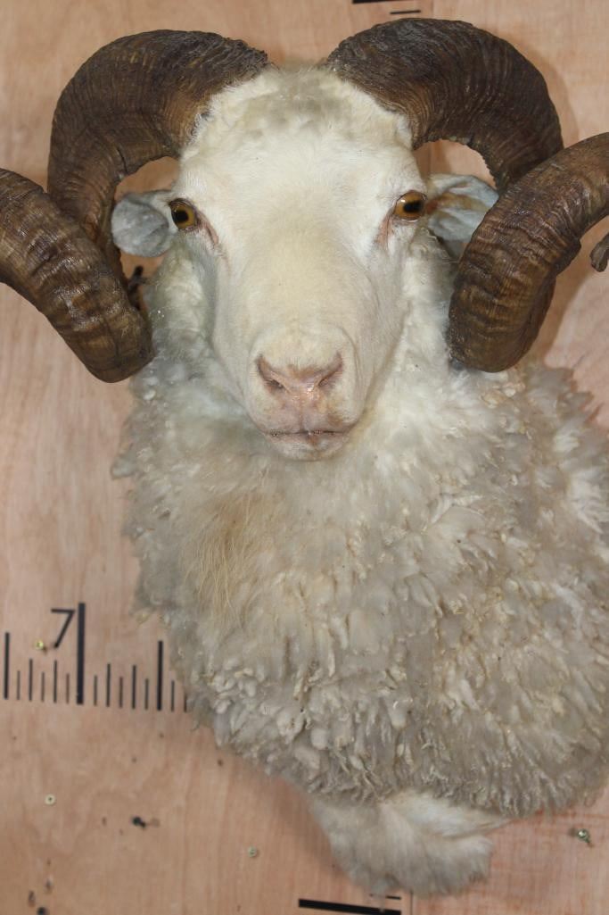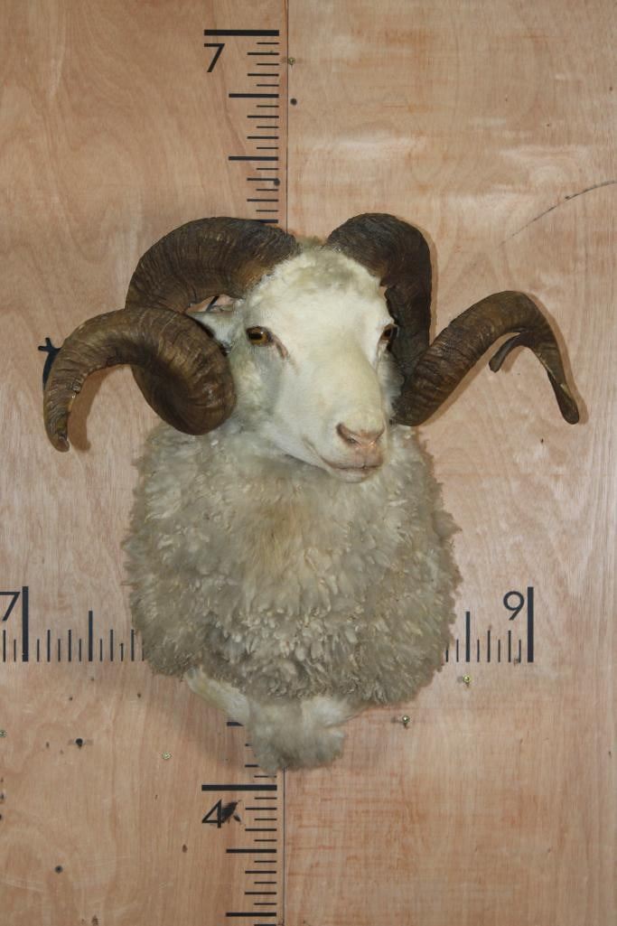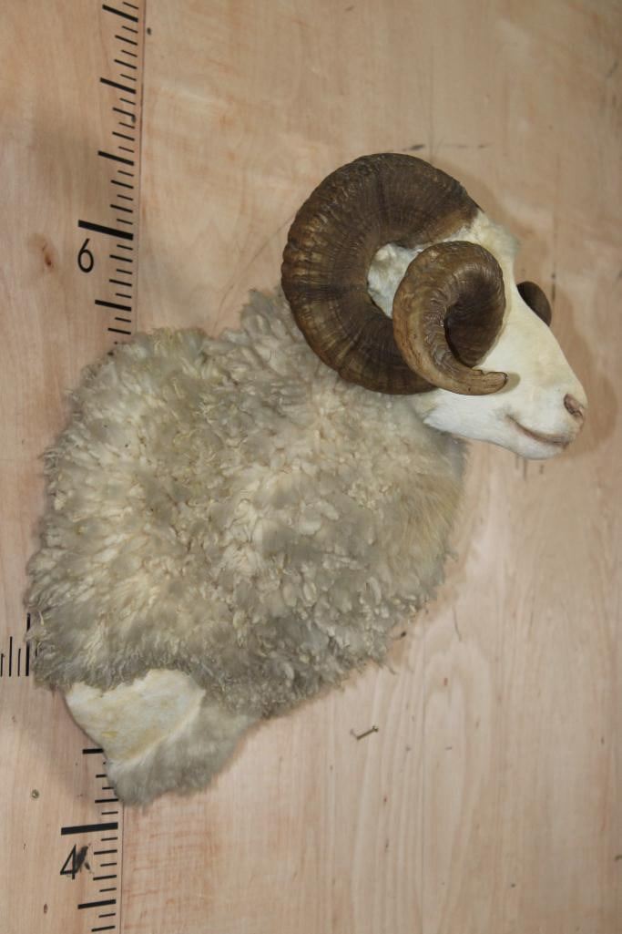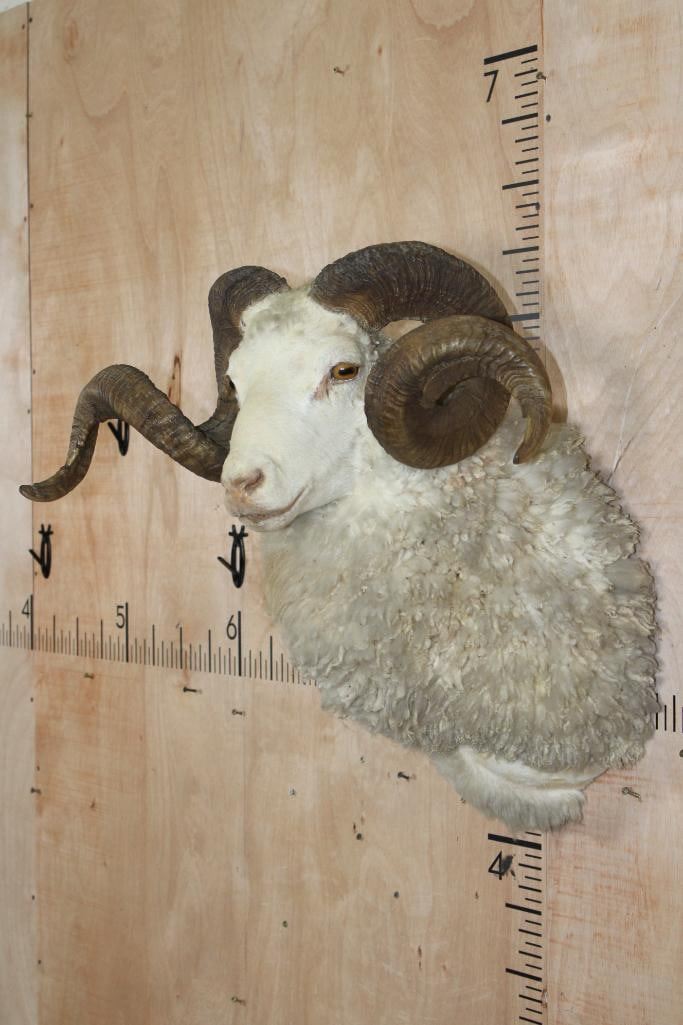 Big MERINO SHEEP Ram with a 23.5" Spread. The Left Horn measures 37" Long and the Right Horn measures 37.25" Long. It is in Good Condition. TAXIDERMY