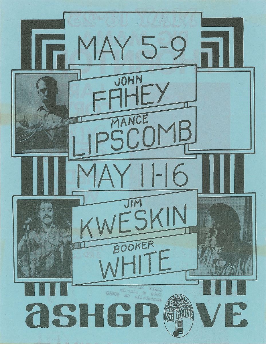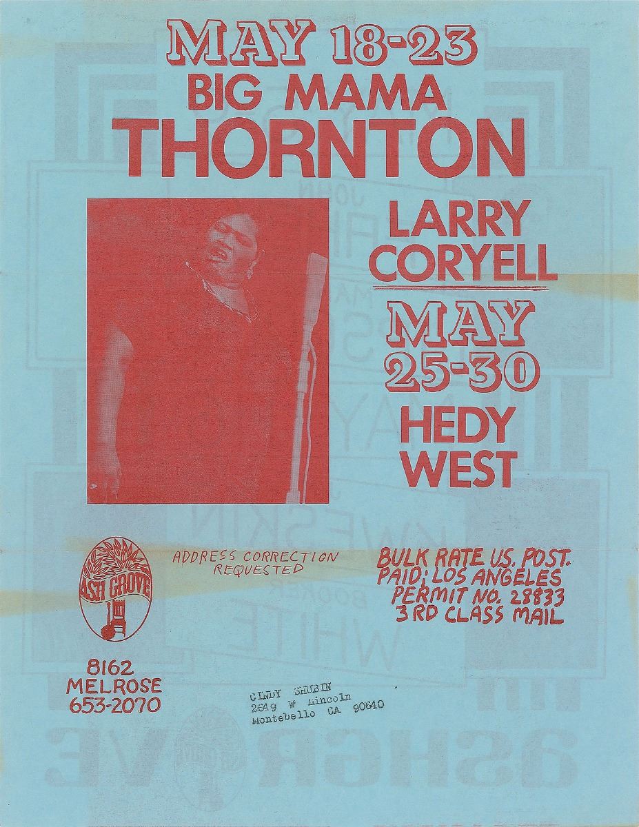 Unsigned double-sided handbill for shows at the famous Ash Grove club in Los Angeles, 8.5 x 11, with one side advertising performances by Big Mama Thornton, Larry Corywell, and Hedy West, and the other side advertising John Fahey, Mance Lipscomb, Jim Kweskin, and Booker White. In fine condition, with light toning along folds.