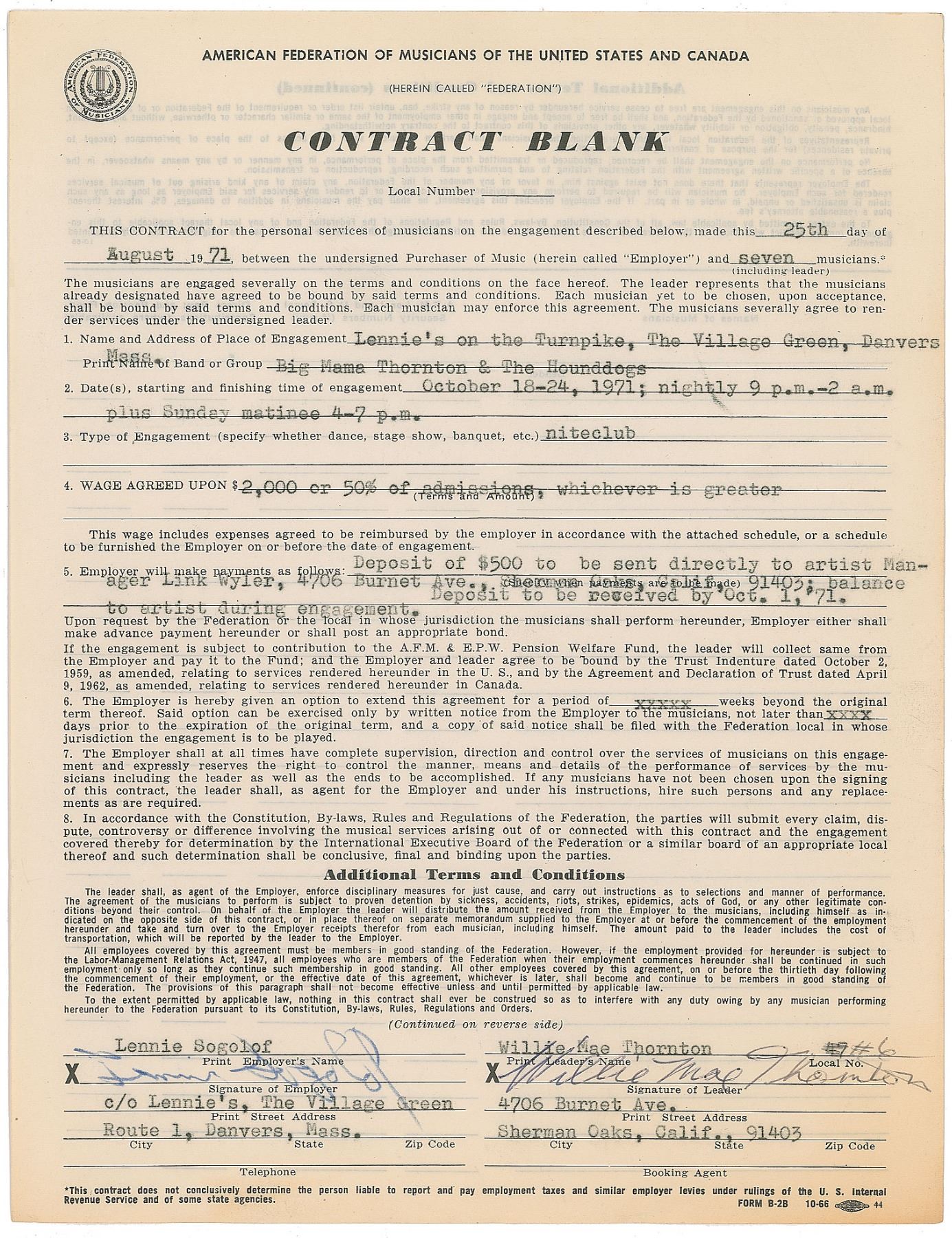 American rhythm-and-blues singer and songwriter (1926–1984) who was the first to record Leiber and Stoller's 'Hound Dog,' a song that stayed seven weeks at number one on the Billboard R&B chart in 1953 and sold almost two million copies. DS, signed “Willie Mae Thornton,” one page, 8.5 x 11, August 25, 1971. American Federation of Musicians contract in which Big Mama Thornton & The Hounddogs agree to play a series of shows at Lennie's on the Turnpike in Danvers, Massachusetts, from October 18–24, 1971, for a sum of $2,000. Signed at the conclusion in black ballpoint by Big Mama Thornton, using her given name. In fine condition. Accompanied by two unsigned glossy photos of Big Mama.
