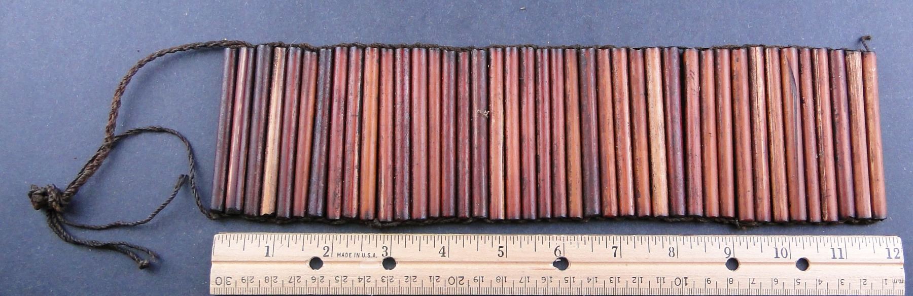 Description: A Papua New Guinea status symbol was an omak, a row of short bamboo sticks suspended from a cord and worn around the neck. Each stick represented an amount of wealth in pigs, shells, axes, etc., to be given with the expectation that they would be repaid at a future ceremony; wearing an omak marked one as a "big man." Not currency itself, but a record of wealth in primitive money. This omak is a foot long and has 41 bamboo sticks. See Opitz, p. 245 (illustrated, left, second from top).