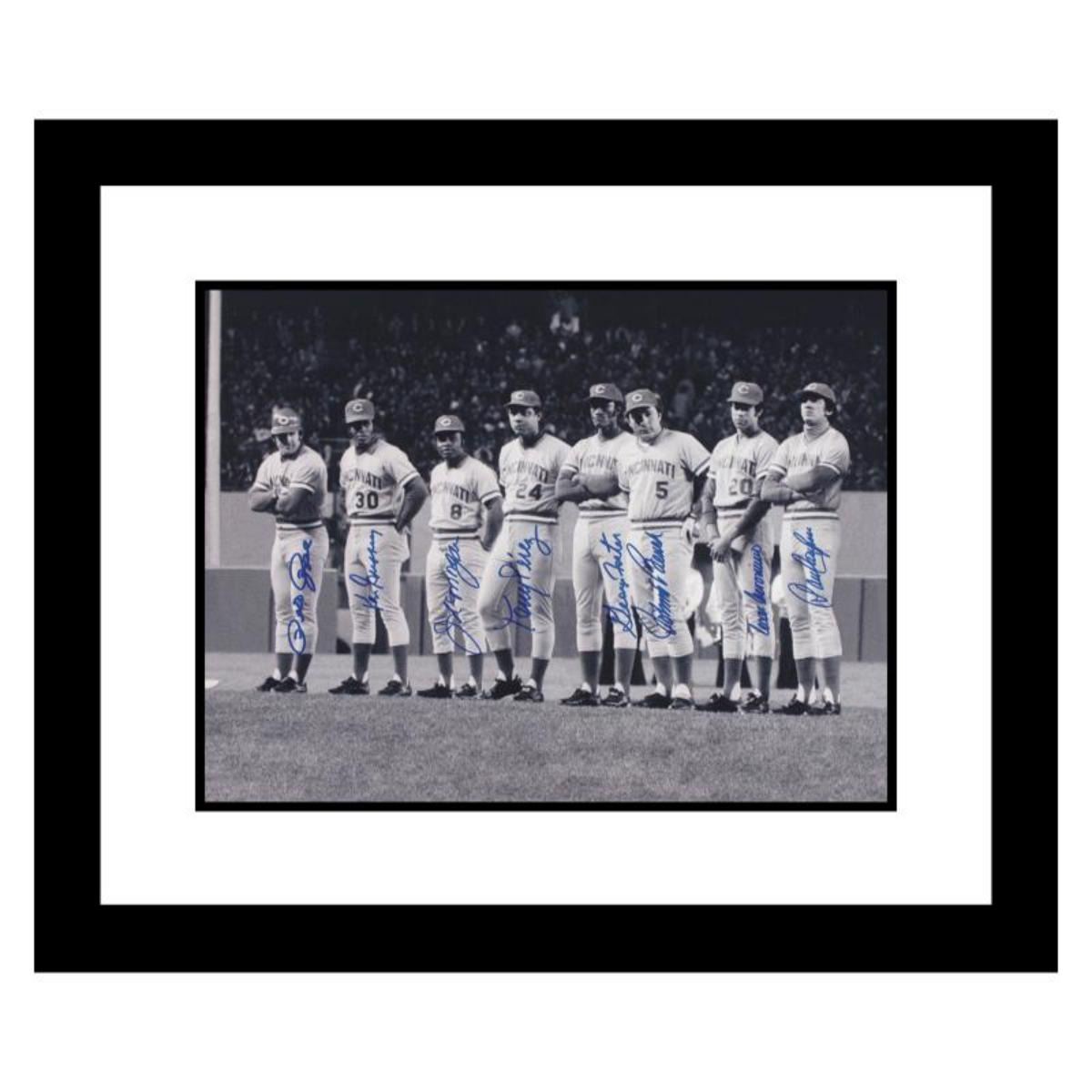 "Big Red Machine Line-Up" is a lithograph featuring signatures from the Big Red Machine's starting eight; Johnny Bench (c), Tony Perez (1b), Joe Morgan (2b), Dave Concepcion (ss), Pete Rose (3b), Ken Griffey (rf), Cesar Geronimo (cf) and Geoge Foster (lf). The Reds became the first NL team since the 1921-1922 New York Giants to win consecutive World Series championships. The Big Red Machine of 1975-1976 is considered one of the best teams ever. This piece comes framed. Includes Certificate of Authenticity. Measures approx. 26" x 22" (frame), 20" x 16" (image). Reference #: 214057.