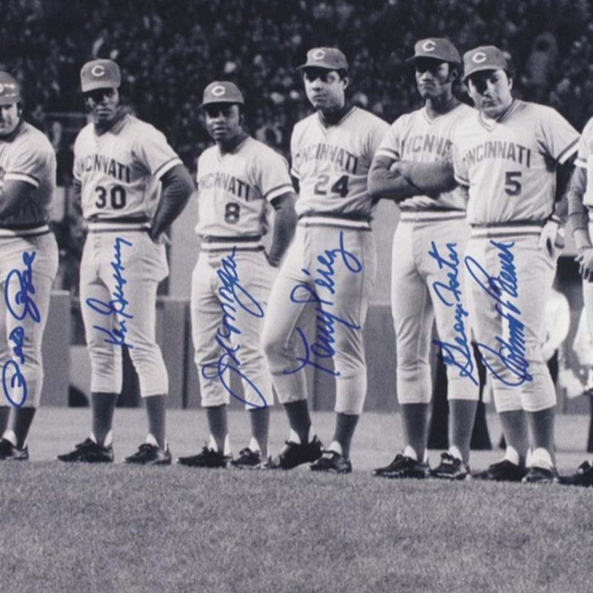 "Big Red Machine Line-Up" is a lithograph featuring signatures from the Big Red Machine's starting eight; Johnny Bench (c), Tony Perez (1b), Joe Morgan (2b), Dave Concepcion (ss), Pete Rose (3b), Ken Griffey (rf), Cesar Geronimo (cf) and Geoge Foster (lf). The Reds became the first NL team since the 1921-1922 New York Giants to win consecutive World Series championships. The Big Red Machine of 1975-1976 is considered one of the best teams ever. This piece comes framed. Includes Certificate of Authenticity. Measures approx. 26" x 22" (frame), 20" x 16" (image).
