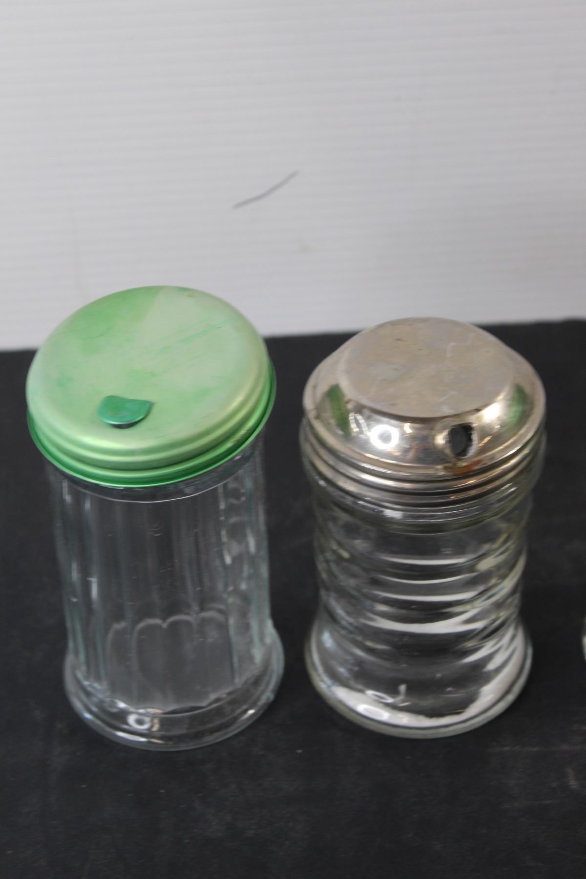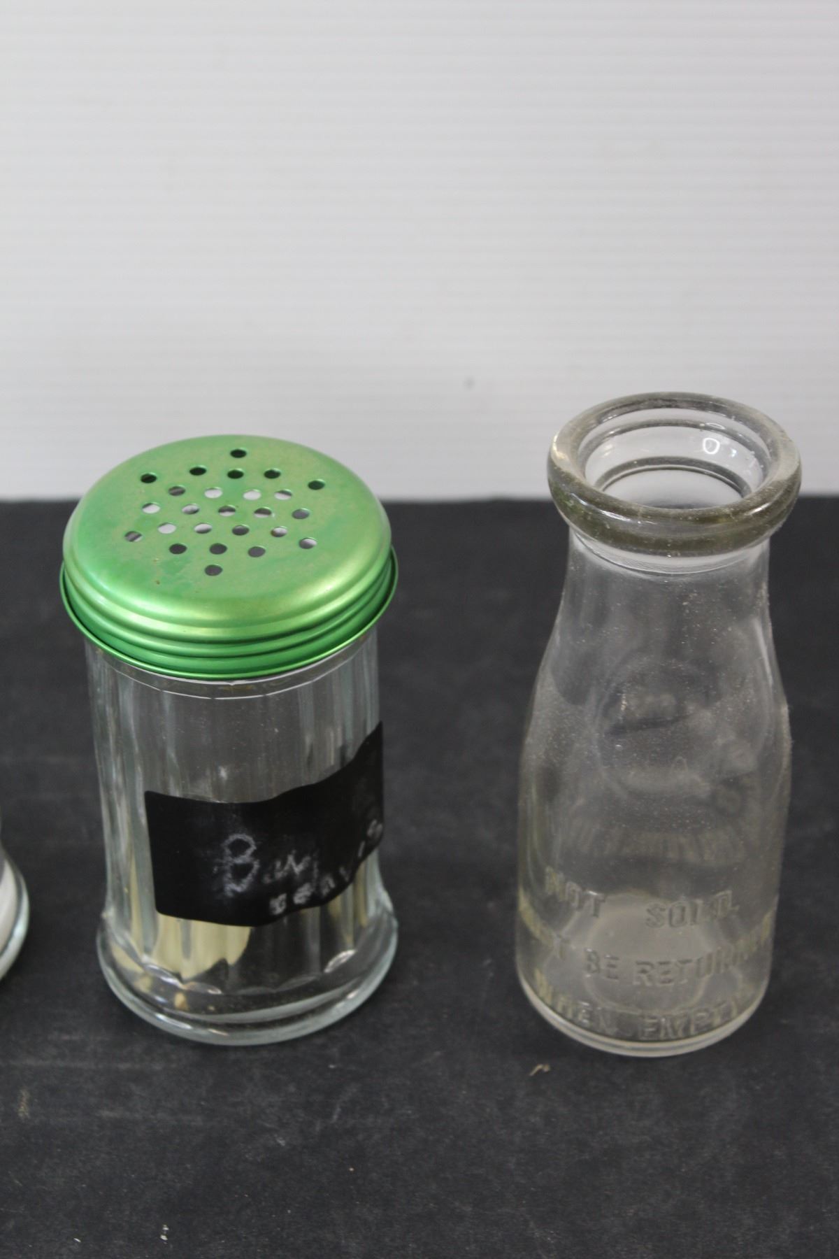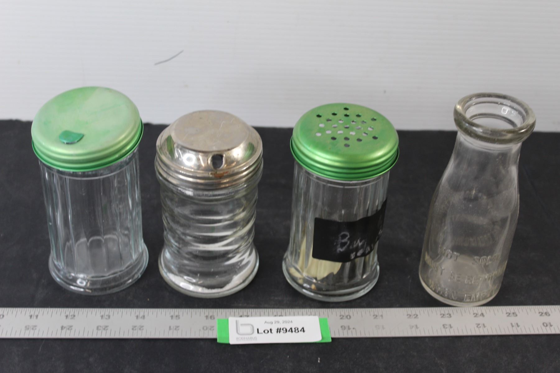 Big Shaker, (2) Assorted Sugar Pourers, Small Glass Milk Jug