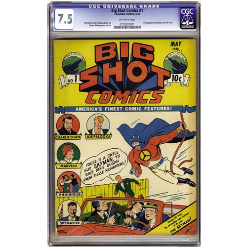 <B>Big Shot Comics #1 (Columbia, 1940) CGC VF- 7.5 Off-white pages.</B></I> The first comic book published by Columbia, this series mixed new features and reprints, both of which are notable: the established characters include Charlie Chan and Joe Palooka, and making their debuts are Skyman (one of the first aviator heroes in comics) and the Face (aka Tony Trent). The artists are recognizable as well, with Ogden Whitney drawing the cover and Fred Guardineer joining Whitney among the interior artists. Overstreet 2006 VF 8.0 value = $1,525. CGC census 03/06: 1 in 7.5, 1 higher.