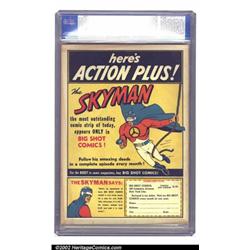 Big Shot Comics #3 (Columbia, 1940) CGC VF/NM 9.0 Off-white to white pages. This is the highest CGC graded copy thus far. The crossover character bondage cover makes for an interesting composition that is fun to look at. This is a very affordable Golden Age comic that may be the nicest copy to ever surface. Overstreet 2002 NM 9.4 value = $825. Important notice: We expect to be auctioning lots at the rate of 200-250 per hour. Sometimes eBay Premier live bid software cannot keep up with that pace, so we strongly recommend that you place a realistic proxy bid now as insurance to avoid disappointment. Also please note that all Heritage/CAA lots purchased through eBay Premier carry a 20% Buyer's Premium. Please make sure you read the Terms and Conditions.