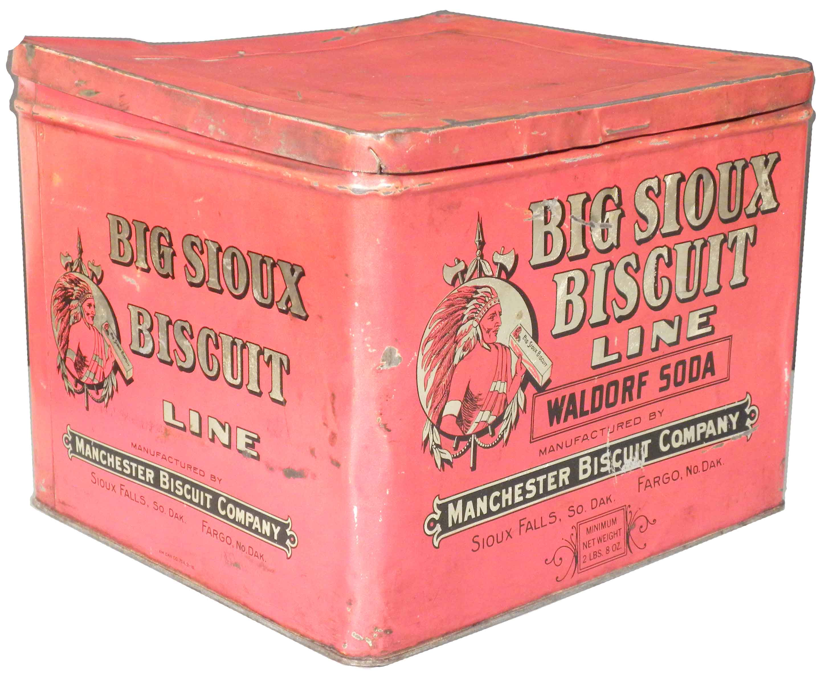 Big Sioux Biscuit Line Tin Store Display Box. Manchester Biscuit Company. Sioux Falls/Fargo S. Dakota. Native American Motif. Dent/fading on lid and some scratches otherwise good condition. 9 X 8 X 7 inches.