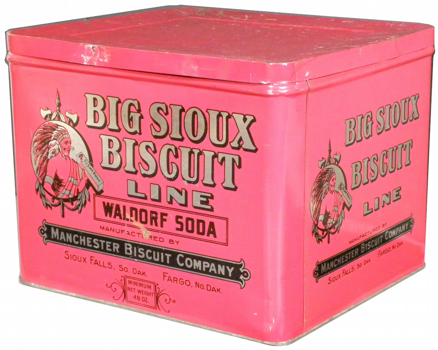 Big Sioux Biscuit Line Tin Store Display Box. Manchester Biscuit Company. Sioux Falls/Fargo S. Dakota. Native American Motif. Dent on lid and some surface scratches otherwise good condition. 9 X 8 X 7 inches.