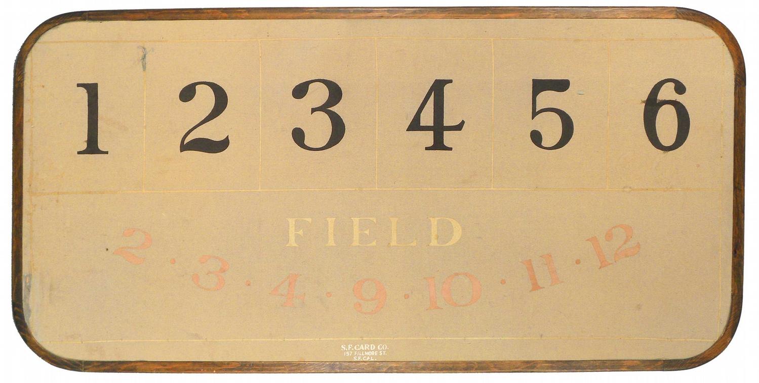 Big Six Gambling Layout. Original felt. Made by S.F. Card Company, San Francisco. Small tear between the one and two and fading otherwise good original condition. 38 X 20 inches.