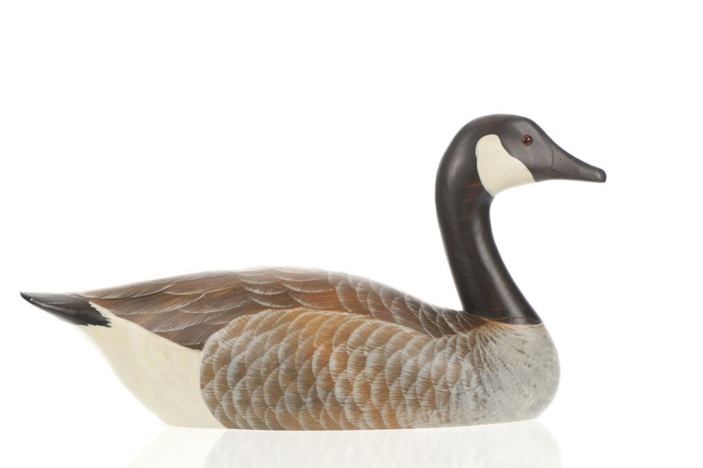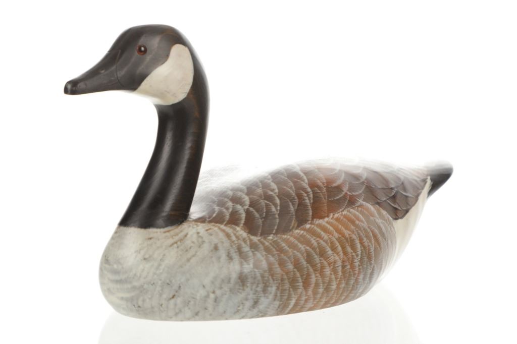 Featured in this lot is this Canadian Goose carved decoy from Bozeman, Montana Big Sky Carvers artist Sally McMurray circa 1995. The carving shows a wonderfully and professionally crafted heavy softwood construction that shows a masterfully painted and detailed design that shows wonderful paint strokes that lend the decoration to be lifelike and shows glass eyes. The decoy is marked on the bottom: Ducks Unlimited - 1995 So. Dakota Special Edition - Big Sky Carvers - Bozeman, MT and is signed by the artist above that and features a Ducks Unlimited medallion set into the bottom. The condition of this carved decoy is is fair to good with a slight repair to the neck of the decoy but otherwise shows fair to good overall condition. The measurements of this decoy is 9" x 17 1/2" x 6".