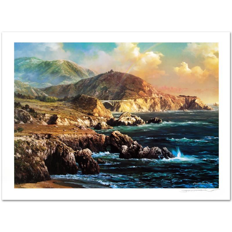 Alexander Chen creates stunningly detailed masterpieces filled with elaborate icons and a touch of fantasy. "Big Sur" is a limited edition offset lithograph on paper by Alexander Chen, numbered and hand signed by the artist. Includes Certificate of Authenticity! Measures approx. 23.5" x 17.5" (with border), 21" x 15" (image).