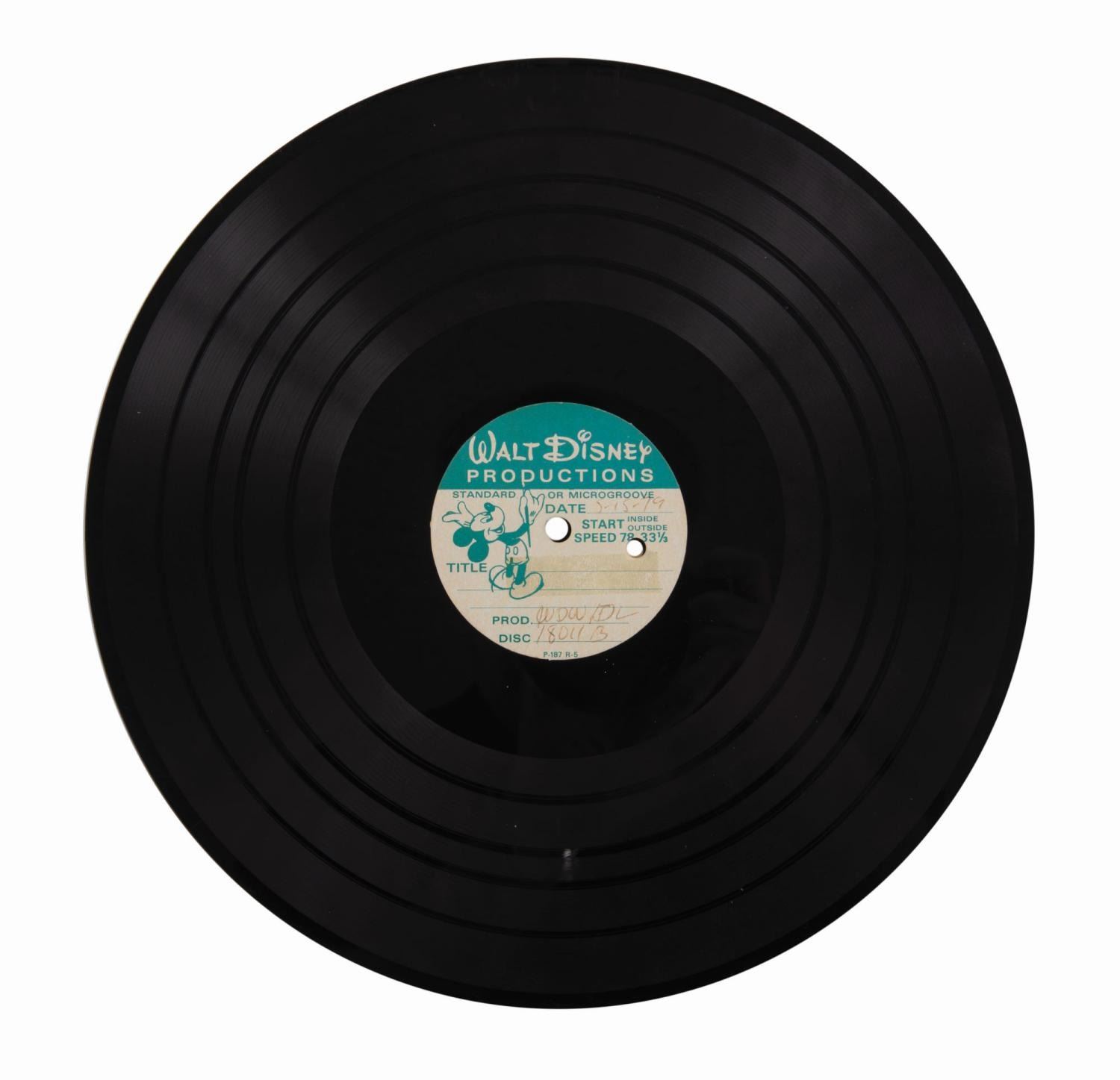 (Disneyland, 1979) An original double-sided acetate recording used in the creation of Big Thunder Mountain Railroad for both Disneyland and Walt Disney World. Contained on this record are several instrumental songs once played in and around the attraction, which are sure to enhance the Show Quality of your very own mining town. The tracks were recorded only months before the Grand Opening of the Disneyland attraction, and the Magic Kingdom version would open the following year. This is truly a rare look into the development of this fan-favorite Disney attraction. Measuring approximately 12" in diameter, the lacquer-over-aluminum record is in very good playable condition with some surface wear, retaining a WDP center label blank that is hand-dated "5-15-79."
