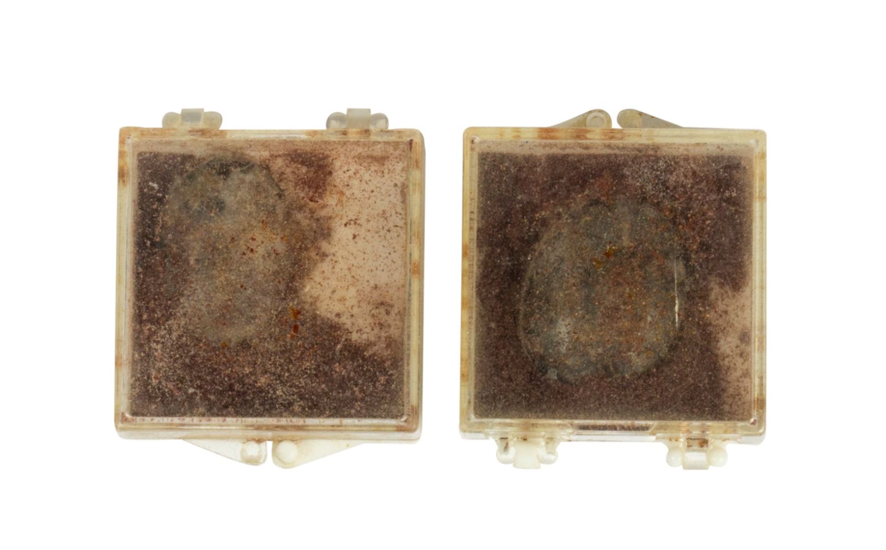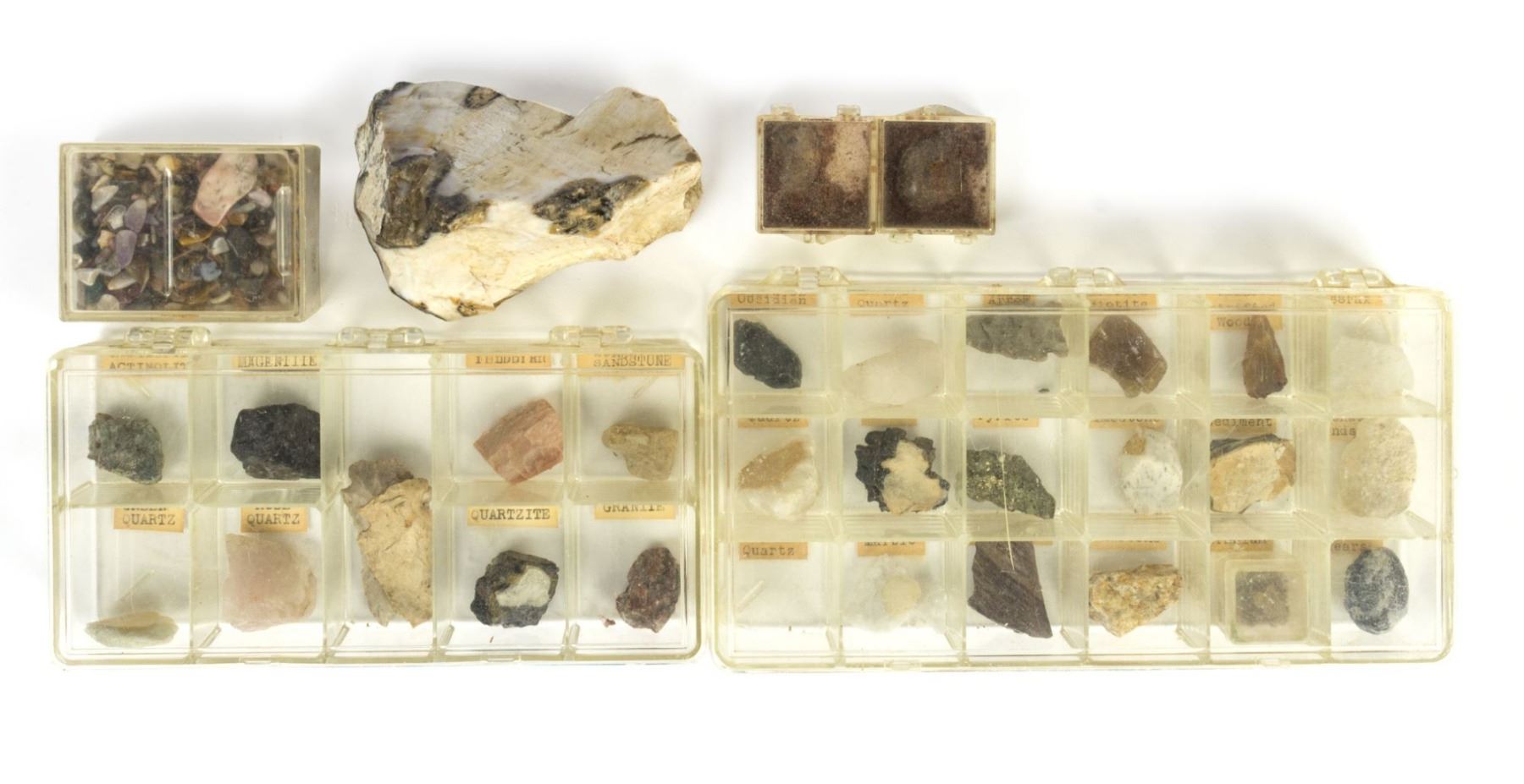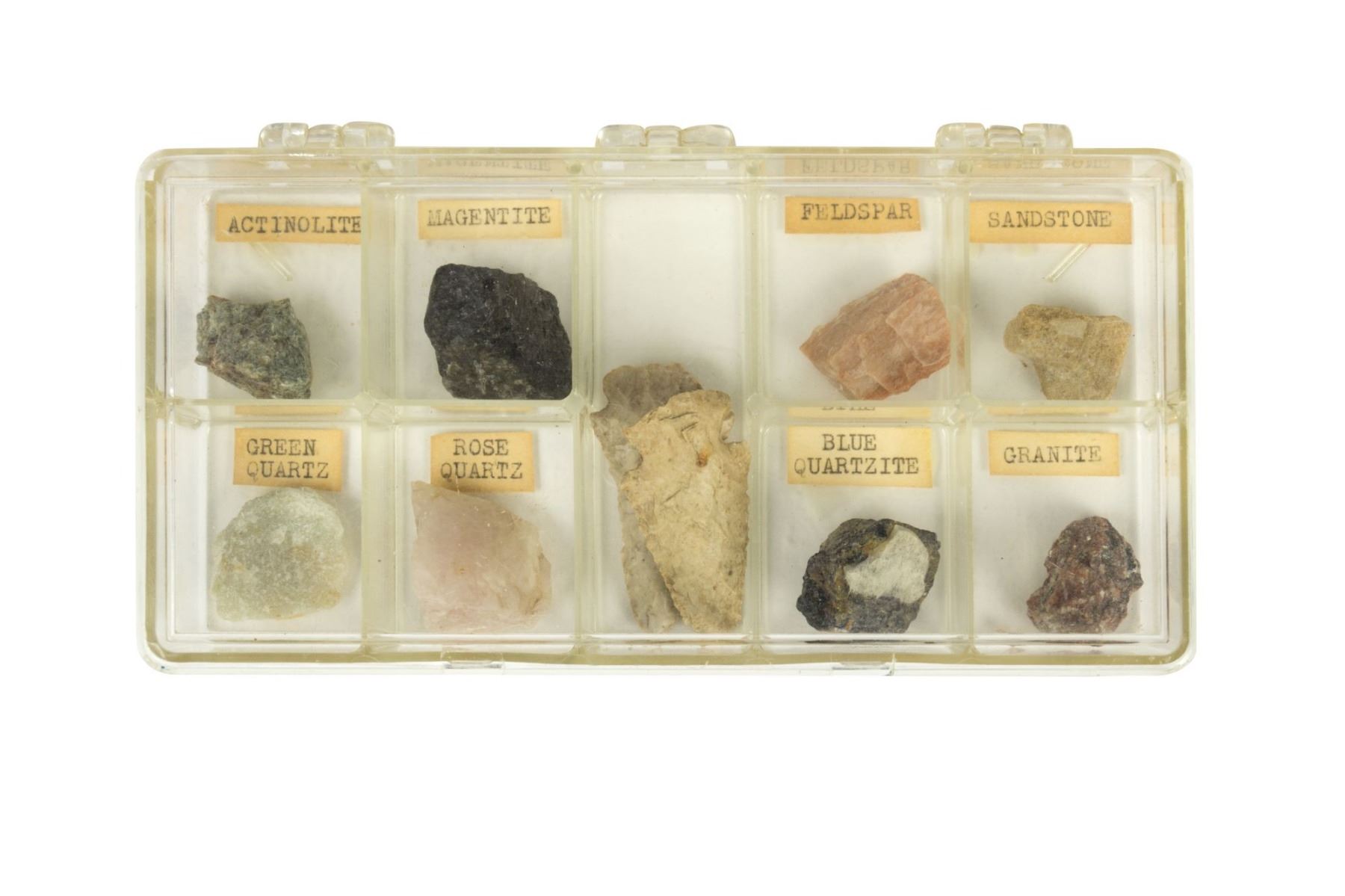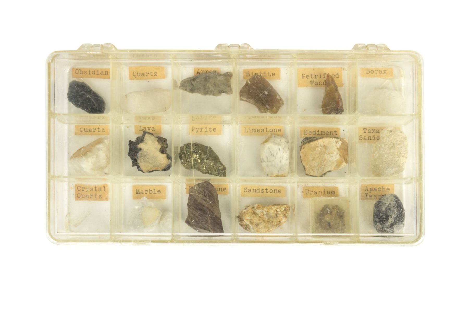 (Disneyland, c.1978) A collection of assorted rock samples from the estate of Imagineer Pat Burke that were used in the development of Disneyland's "Big Thunder Mountain Railroad". Rock samples such as these allowed the Imagineering team to create as realistic of an environment as possible for the attraction, and show the research and dedication to authenticity that have helped make the Disney parks well known for their exceptional quality. The samples range in size, with the largest sample measuring approximately 3"x4" and 3.5" deep, and many samples measuring approximately 1"x1"x1". The condition is very good with expected wear from use. Over 20 samples come in two protective cases with typed labels displaying the names of the samples.