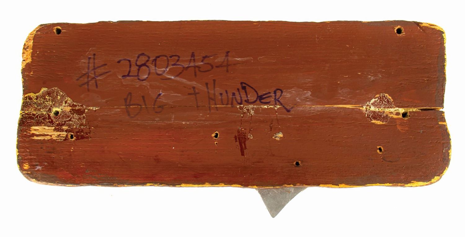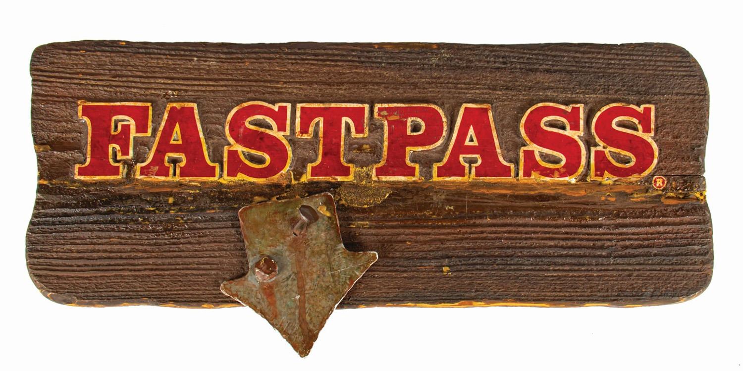 (Disneyland, c.2000s) A park-used fastpass sign from Big Thunder Mountain Railroad. The wooden sign proudly reads "Fastpass" above a metal arrow designating the fastpass location. Measuring 6.5"x14.5", the sign is in fair condition with expected wear from park use. There is visible glue residue on the surface from a repaired split in the center, some chipping to the paint and wood surface, and wear to the paint on the arrow.