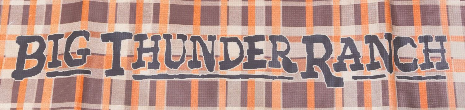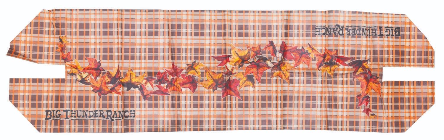 (Disneyland, 2000s) A form-fitted vinyl table covering used during the fall season at Disneyland’s Big Thunder Ranch BBQ. The picnic table cover features a harvest-themed plaid print with a central graphic of colored autumn leaves. Measuring 110.5” x 31.5”, the piece is in very good condition with some general wear and surface loss from use.