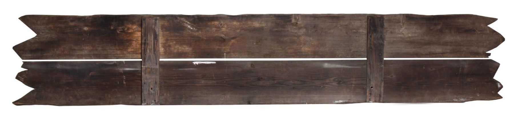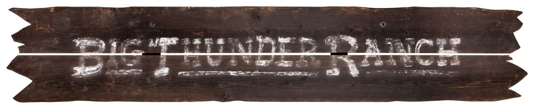 (Disneyland, c.1986) A large wooden entrance sign to "Big Thunder Ranch" at Disneyland. This single-sided sign has large painted letters and two heavy metal screws that were used to hang the sign. This sign measures approximately 22"x108" and is in good condition with some expected wear throughout from park use.