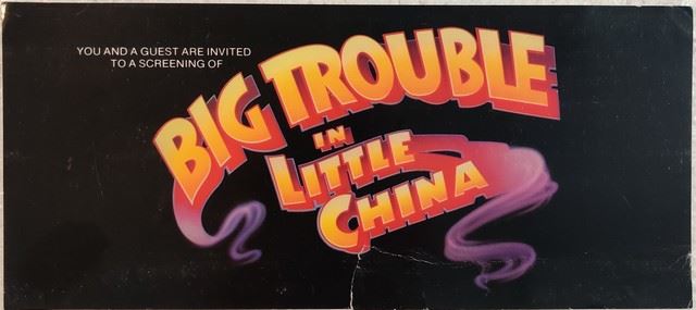 Big Trouble in Little China (20th Century Fox, 1986) screening invitation. Adventure, Action, Comedy, Fantasy. Starring Kurt Russell, Kim Cattrall, Dennis Dun, Kate Burton, Victor Wong, James Hong, Donald Li, Carter Wong, Suzee Pai, Craig Ng, Dawna Lee Heising, Chao Li Chi. Directed by John Carpenter. Minor edge wear, minor creases, tear. Excellent. (9"x4").