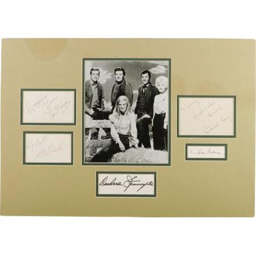 <B>"Big Valley" Cast Autograph Collection.</B></I> Includes autographs by Lee Majors, Barbara Stanwyck, Linda Evans, Richard Long, and Peter Breck, matted along with a b&w 8" x 10" photo of the aforementioned cast of the classic '60s TV Western series, to an overall size of 22.5" x 16". The signatures are in overall Excellent condition with some mild age toning. <I>Accompanied by LOA from PSA/DNA.</B></I><BR><BR><b>Shipping:</b> Flat Material, Large (<a target="_blank" href="http://www.heritageauctions.com/common/shipping.php">view shipping information</a>)
