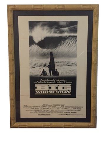 Original, one sheet, framed movie poster for "Big Wednesday" starring Jan-Michael Vincent, William Katt and Gary Busey . 1978 Warner Bros. Very Fine condition with the exception of three discolored creases from fold wear, showing its age. Glass framed with black matte border. Matt Johnson, Jack Barlow, and Leroy Smith are three young California surfers in the 1960s. At first reveling in the carefree life of beaches, girls, and waves, they eventually must face the fact that the world is changing, becoming more complex, less answerable by simple solutions. Ultimately the Vietnam war interrupts their idyll, leaving them to wonder if they will survive until "Big Wednesday," the mythical day when the greatest, cleanest, most transcendent wave of all will come. (43"x31")