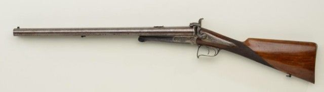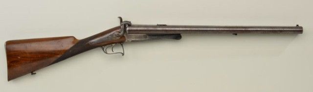 Big bore pin fire double rifle by Devisme of Paris approx. 8 gauge pin-fire full rifled measuring 40-1/4” overall with 23-5/8” barrels, serial #2297. The barrels show a under lever release and 3 folding rear sights with large bead front sight in long base. The rifle remains in original near fine condition with 90% plus bright tobacco brown finish in a Damascus pattern. The locks and frame show 50-70% case hardening drifting tosilver with some rainbow colors. The trigger guard and small parts show most of their bright fire blue, the stock is very good plus with some minor scratches and mars and crisp checkering. The rifle is mounted smallsling swivels and a blued steel butt plate. The action is crisp, the bores are bright. The rifle weighs 11lbs and is the biggest caliber pin-fire double (rifled from breech to muzzle) Big Game Hunting gun we have evercatalogued. Devisme was a well known maker and inventor who made many oddities, knife pistols and patented inventions in the arms field. A rare pin-fire by a premier maker. Est.;$7,000-$14,000.