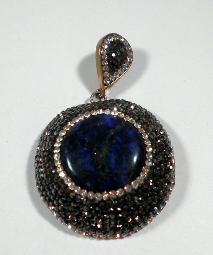 Big round silver and brass pendant set with central lapis setting surrounded by transparent and black gemstones, weight: 44.1 gm, dimensions: 4.5x7.5 cm.