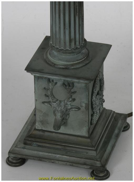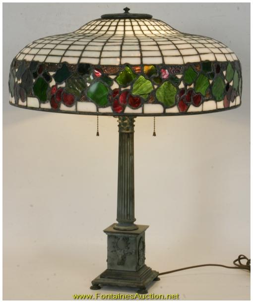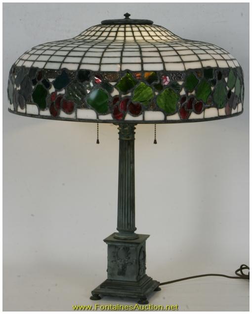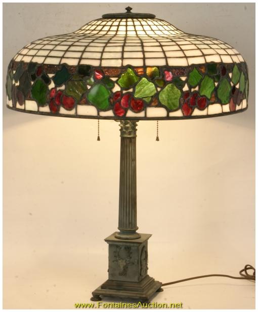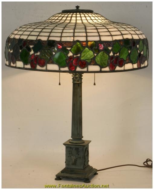 Bigelow & Kennard 20" Grapevine Table Lamp. 20" Geometric shade with a white brick background, has a border of red grapes and green leaves with a single band of brown above and below, all in nice translucent glass; shade signed "Bigelow & Kennard & Co - Boston". On an unsigned base, has a fluted column stem and a square lower platform with a elk's heads and wreaths. 20"W x 25"H. Estimated Value$3,000 - 5,000.