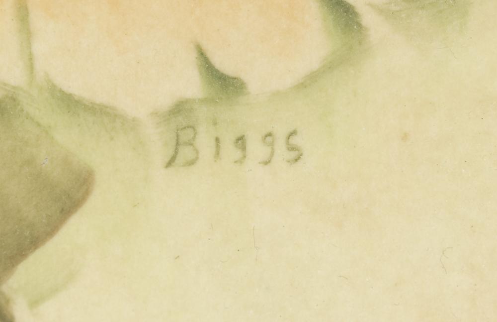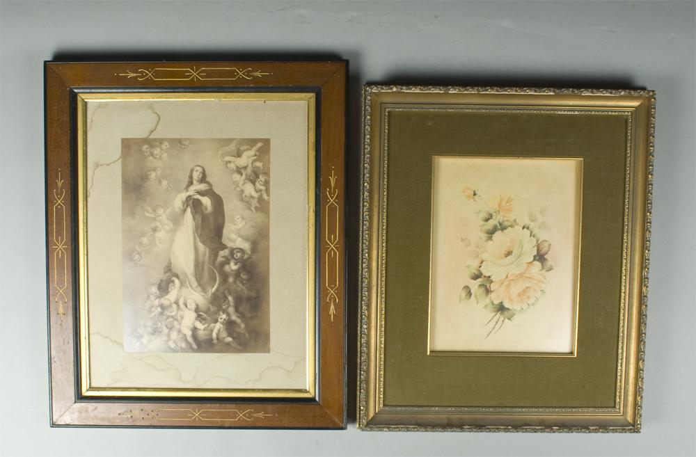Depicting a still life of an orange and white rose. Possibly John Biggs, Missouri. 12" H x 8.5" W (sight), signed in LR of flower, framed behind glass. Together with a process print of the Asscention of Mary, 13" H x 9" W (sight), in frame, water stains throughout. 20th Century.