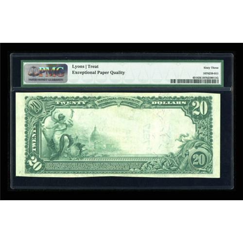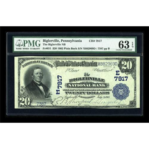 <B>Biglerville, PA</B></I> - $20 1902 Plain Back Fr. 651 <B>The Biglerville NB</B></I> Ch. # (E)7917<BR> This high grade $10 will raise the population to 8 Large for this charter that had a low LSO (Large Size Outstanding) of only $2,370 in 1935. The signatures of R.B. Thompson and C.L. Longsdorf are in two different color inks with one a stamp and the other in blue pen. Most likely condition census for the bank as the majority of surviving examples are circulated. <B>PMG Choice Uncirculated 63 EPQ.<BR></B></I><I>From The Warren Marshall Collection</B></I><BR><BR><b>Shipping:</b> Coins & Currency (<a target="_blank" href="http://www.heritageauctions.com/common/shipping.php">view shipping information</a>)