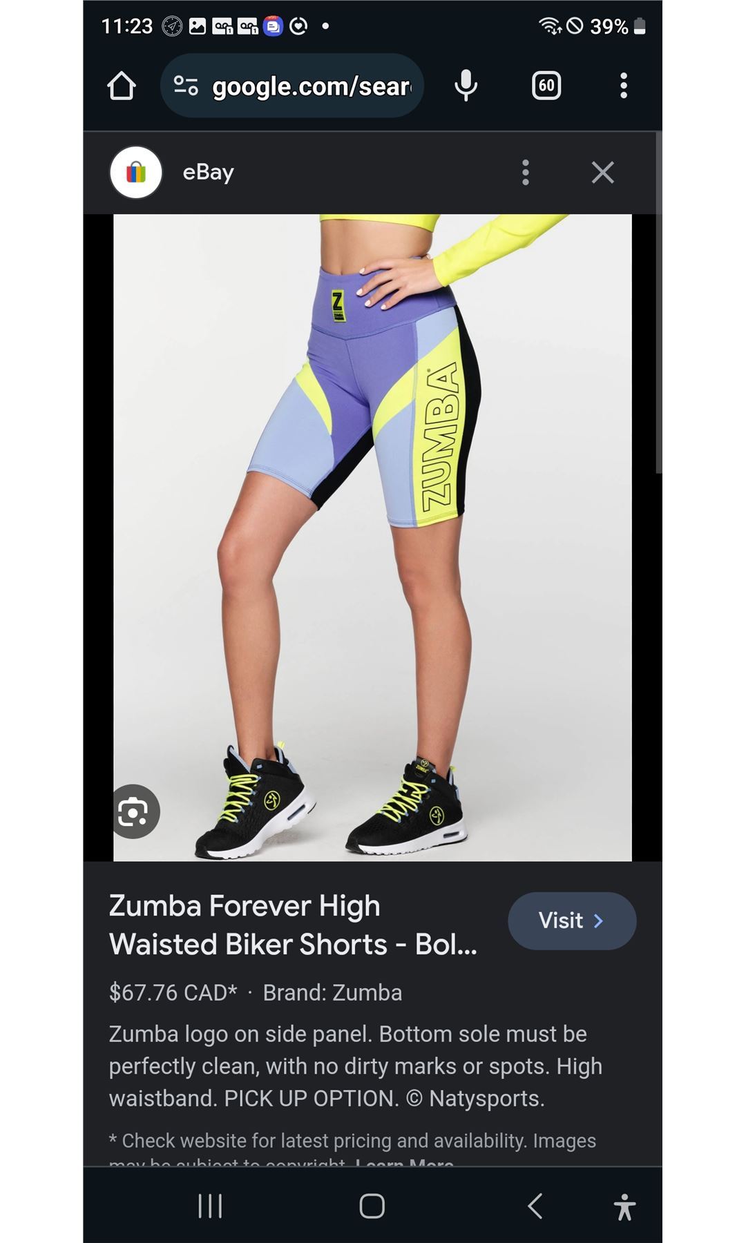 Vibrant purple and yellow design with bold Zumba branding, stretch fabric for comfort, new condition.