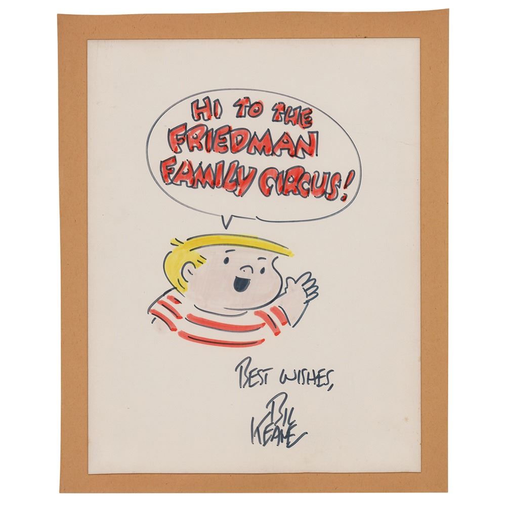 Original felt tip sketch of Jeffy from Family Circus on a white 6.75 x 9 card, inscribed within a speech bubble, "Hi to the Friedman Family Circus!," and signed below by the cartoonist, "Best wishes, Bil Keane." In fine condition. Accompanied by the original mailing envelope, addressed in Keane's hand.
