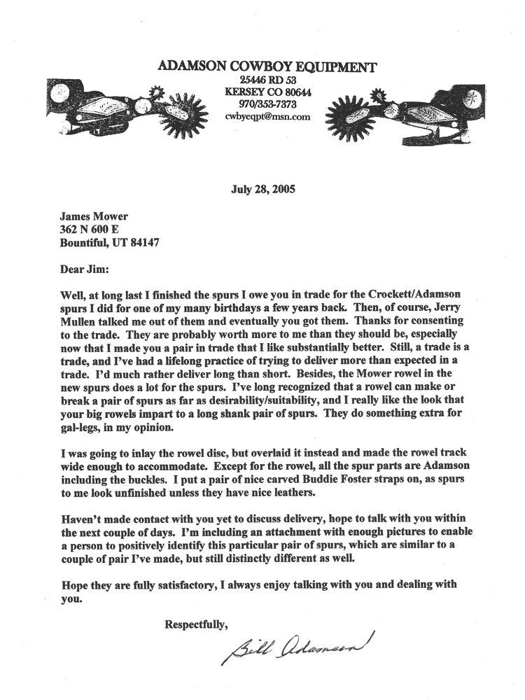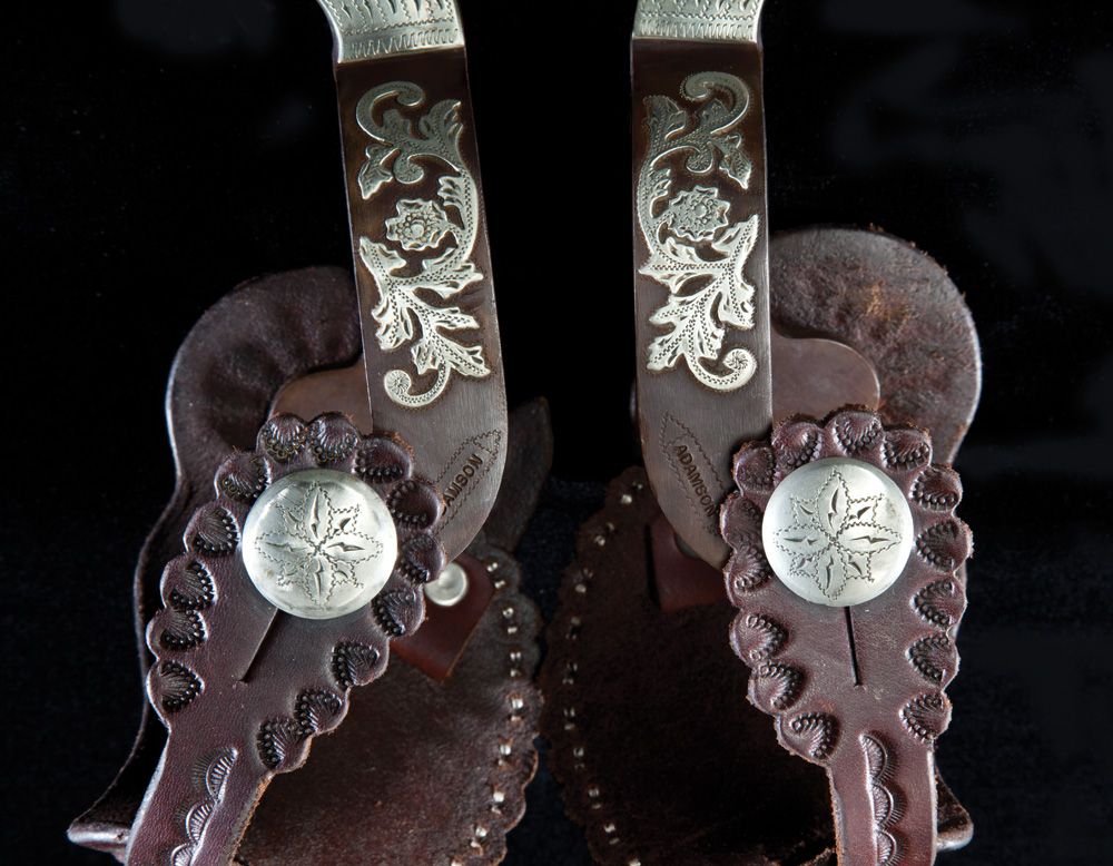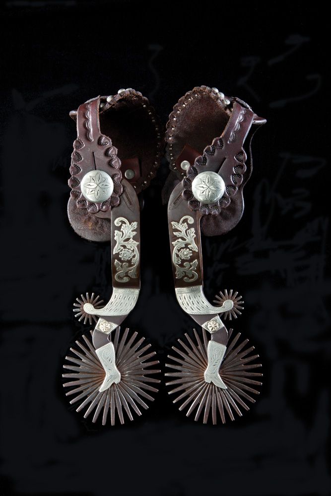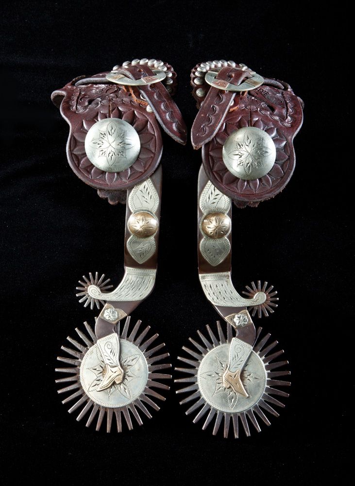 Large and impressive Crockett style ladies leg spurs by the renowned Colorado maker featuring 7/8” bands, 3 1/4” long shanks, rowelled chap guard, extra large “James Mower” 3” rowel with 32 points, 2- tone, brass and silver mountings. Huge 1 3/8” spur strap buttons, Buddie Foster straps with Adamson marked buckles. Includes letter from Bill Adamson to James Mower dated 2005.