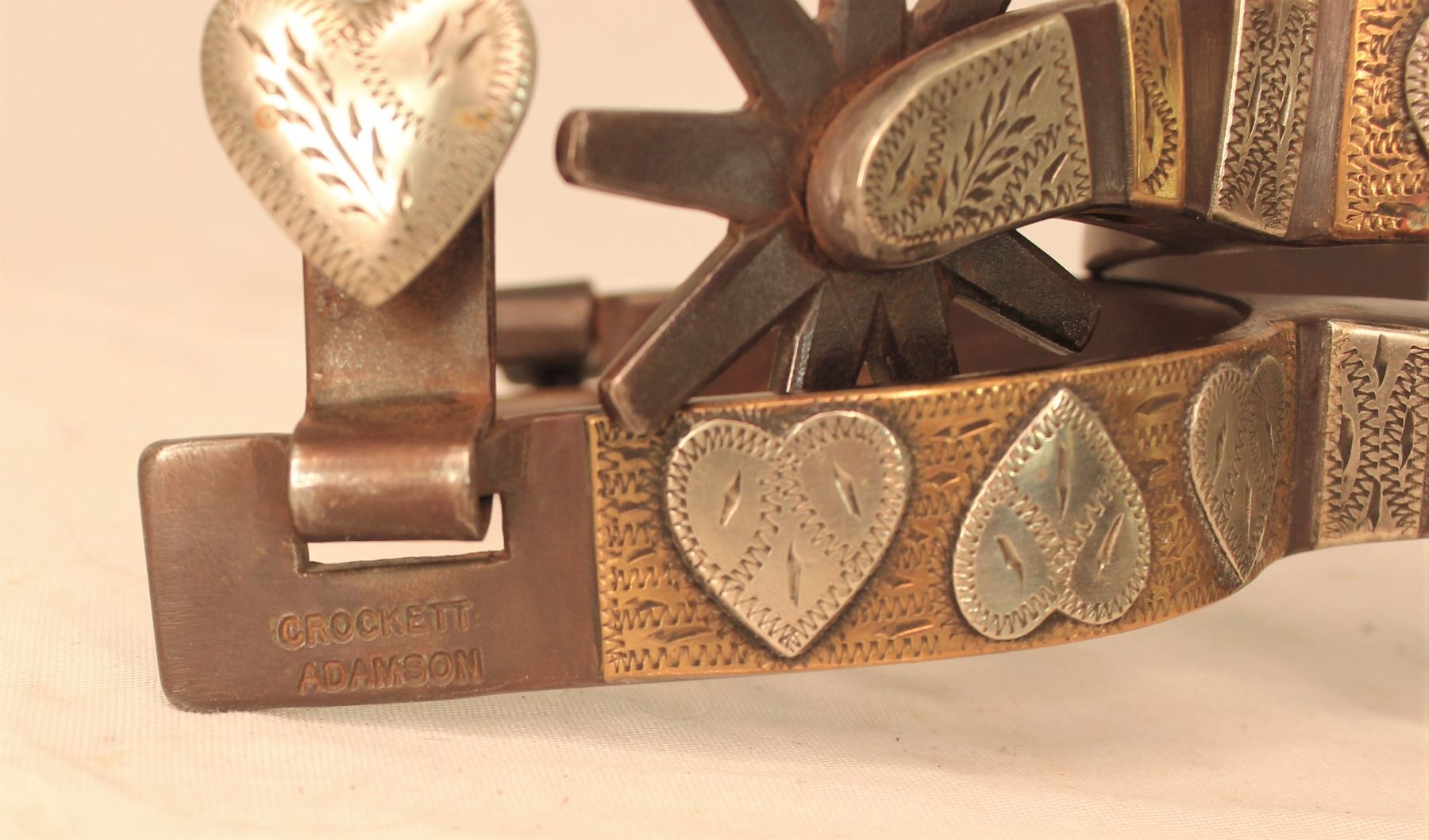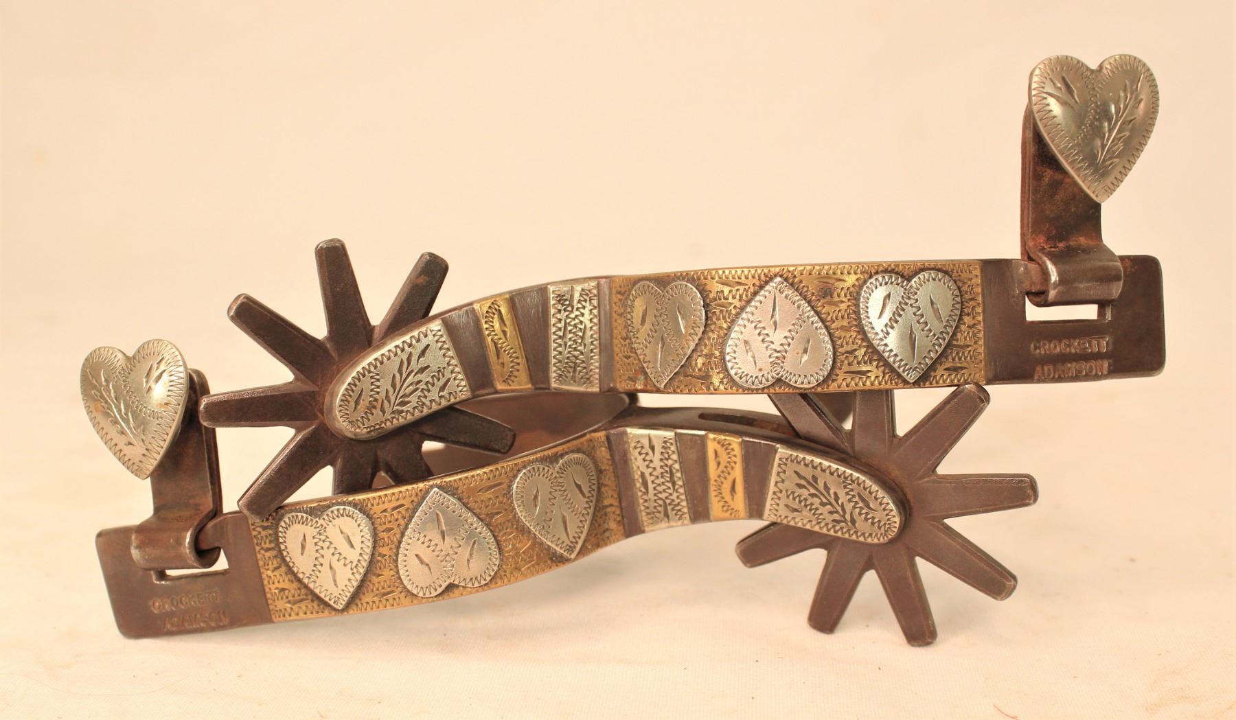 Unusual medium size single mounted Adamson-Crocketts done in four hearts pattern with wonderful brass and silver mountings.