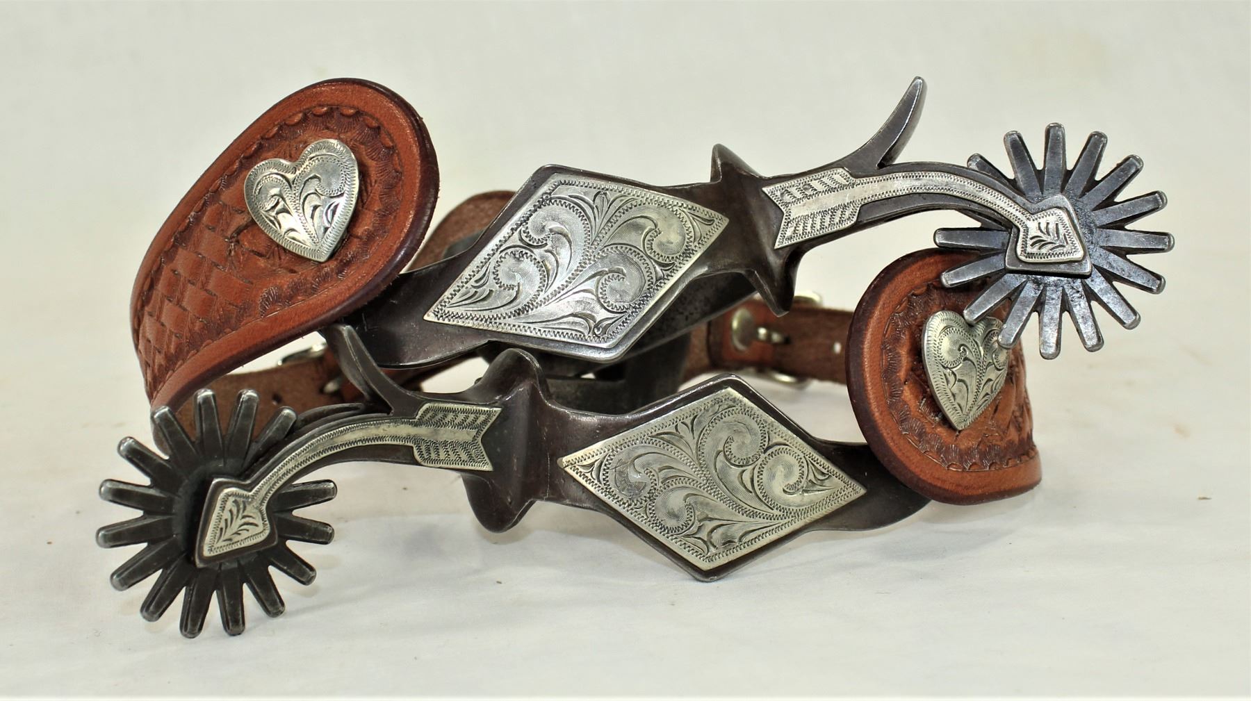 A stylish pair of single mounted spurs with large diamond heelbands and arrowshanks.