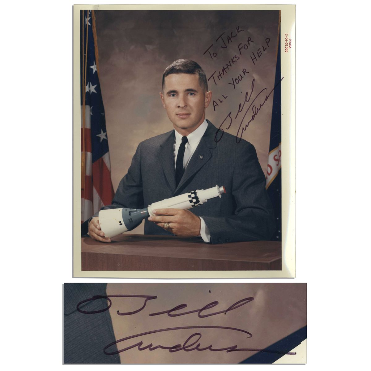 Apollo 8 astronaut Bill Anders signed and inscribed official NASA photo. Photo depicts Anders posing in a suit and is inscribed in black marker at upper right, ''To Jack / Thanks for all your help / Bill Anders''. Glossy photo measures 8'' x 10'' with slight curling to edges, else near fine. With an LOA from Swigert's sister.