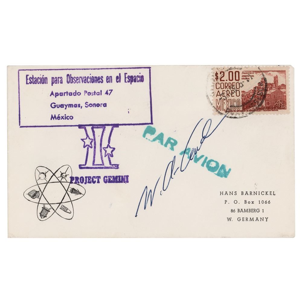 Commemorative cover with a cachet honoring Project Gemini and the NASA flight tracking station in Guaymas, Sonora, Mexico, signed in blue ballpoint, "W. A. Anders." In fine condition.