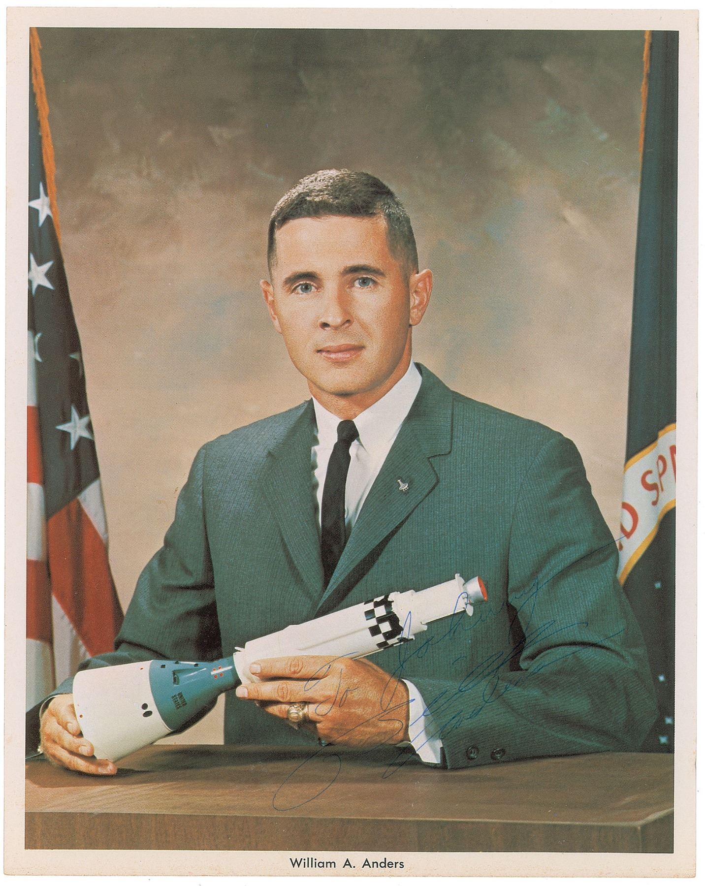 Sought-after official color 8 x 10 NASA lithograph of the Apollo 8 Lunar Module Pilot posing with a capsule model, signed and inscribed in blue ballpoint, "To Johnny, Bill Anders." In fine condition, with moderate signature contrast.