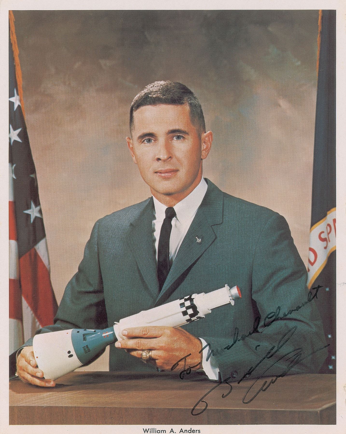 Official color 8 x 10 NASA lithograph of Anders posing with a spacecraft model, signed and inscribed in black felt tip, "To Michael Chenault, Bill Anders.” In fine condition.