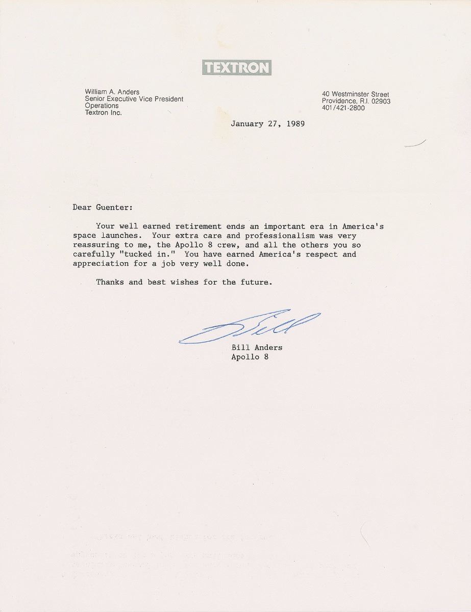 TLS signed “Bill,” one page, 8.5 x 11, Textron letterhead, January 27, 1989. Letter to Guenter Wendt. In part: “Your well earned retirement ends an important era in America’s space launches. Your extra care and professionalism was very reassuring to me, the Apollo 8 crew, and all the others you so carefully ‘tucked in.’ You have earned America’s respect and appreciation for a job very well done.” In fine condition. The Guenter Wendt Collection, ex. Ken Havekotte.