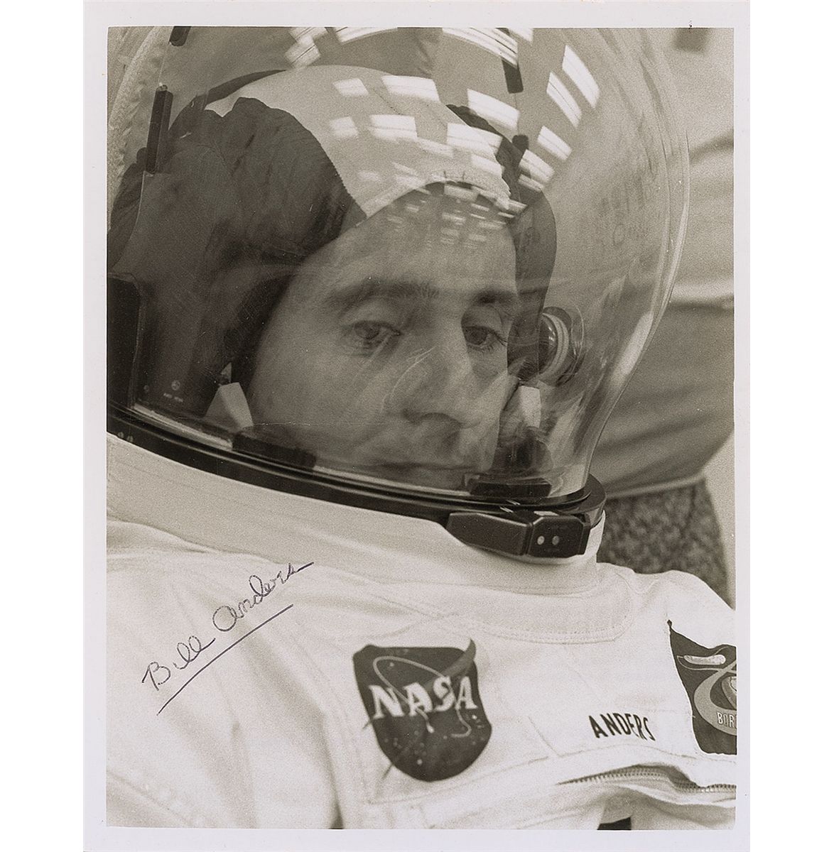 Uncommon glossy 8 x 10 NASA photo of Anders suited up for the Apollo 8 mission, signed in black ballpoint. A noticeable central horizontal crease, otherwise fine condition. The consignor obtained this from Anders directly through the mail. A notoriously reluctant signer, Anders often times intentionally signs differently, childishly slow, and has been known to bend photos just to upset collectors and affect the value and desirability of his autograph. This particular photo is a perfect example of this astronaut’s curmudgeonly signing habits.